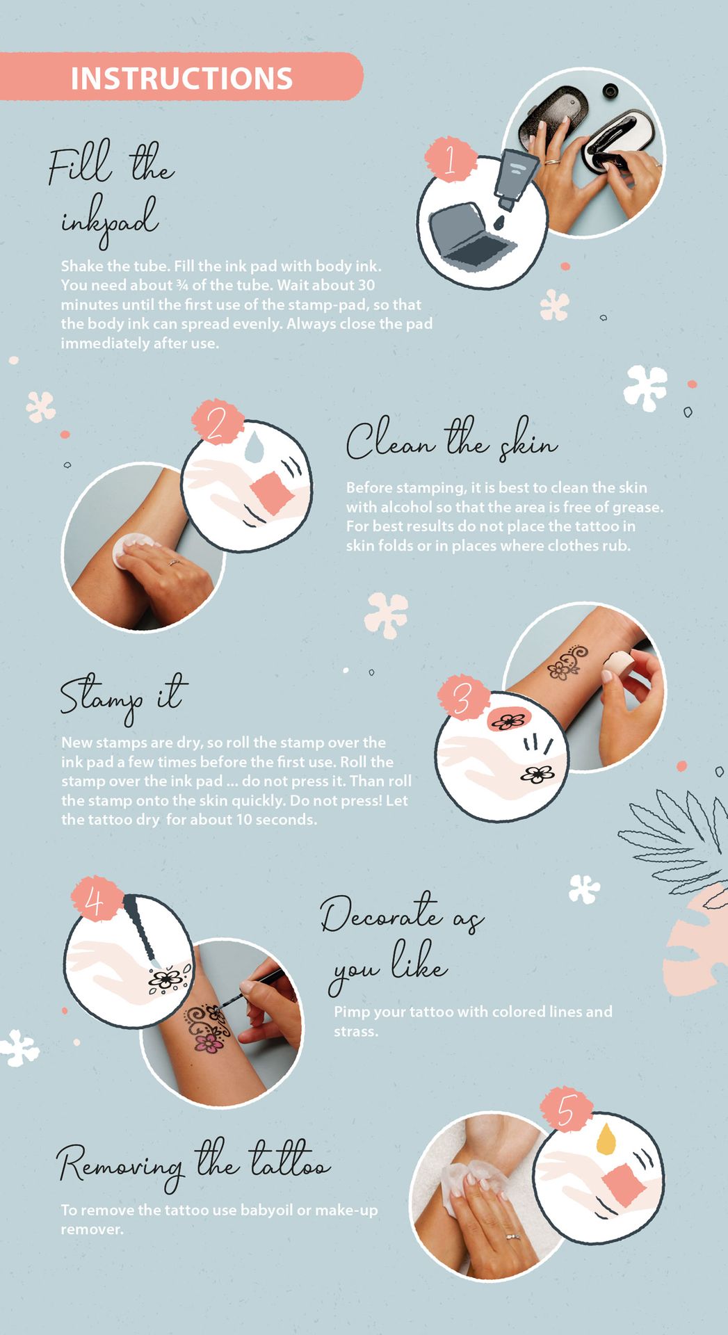 - or dem ersten Stempeln reinigen Sie die Hautstelle am besten mit Alkohol, damit die Stelle fettfrei ist. Bitte platzieren Sie das Tattoo nicht in Hautfalten oder an Stellen, an denen die Kleidung reibt.