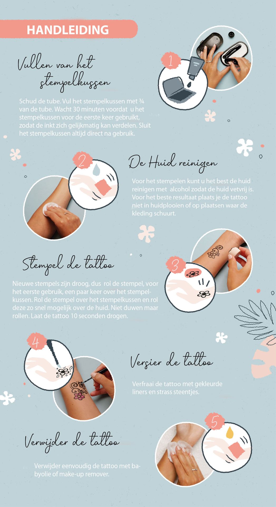 De tattoo kunt U verwijderen met make-up remover of baby-olie. Na het aanbrengen van de tattoo geen créme of andere vettigheid op de tattoo aanbrengen. Na het douchen de tattoo deppen en niet wrijven. Hiermee kunt U deze beschadigen. Alleen voor extern gebruik. Gebruik niet dicht bij de ogen. Gebruik onder volwassen supervisie.