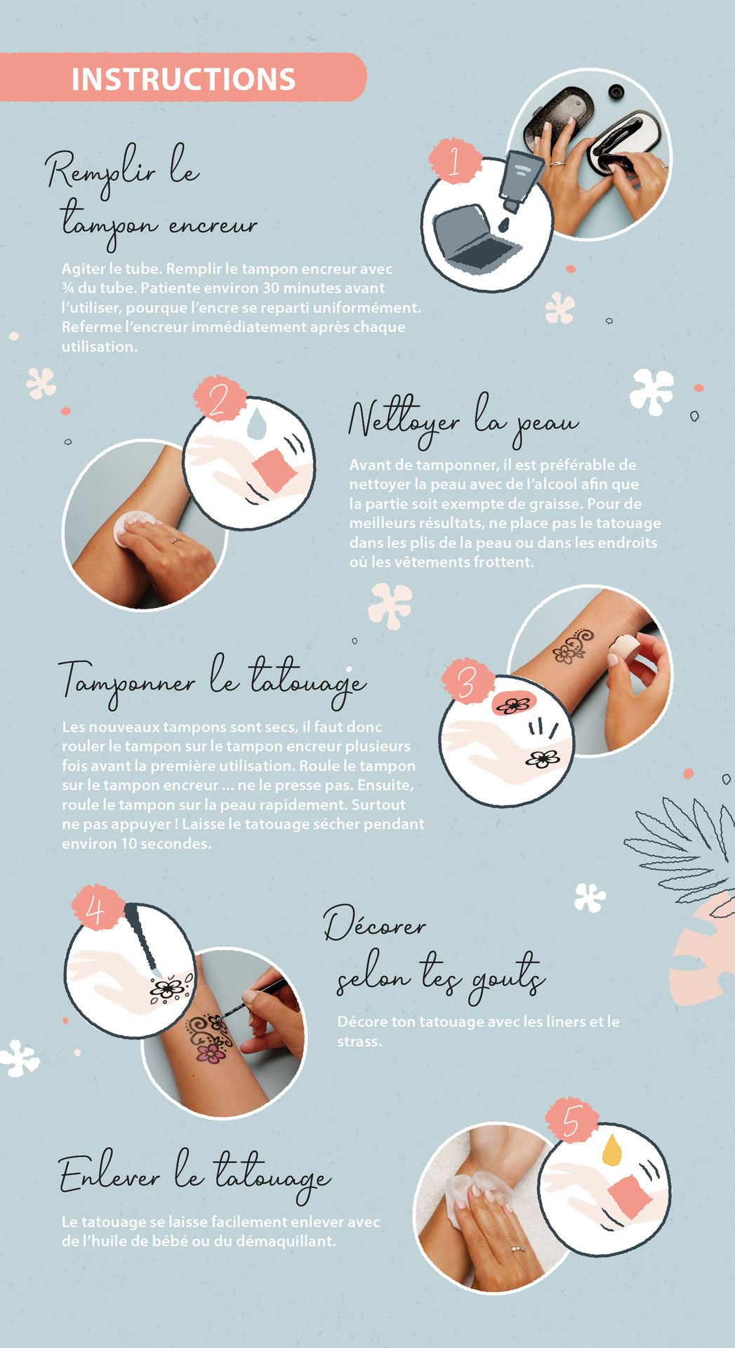 - Ensuite décorez votre tatouage avec des liners , des strass , et des paillettes (appliquer de la colle dermique avant, fournie avec)
